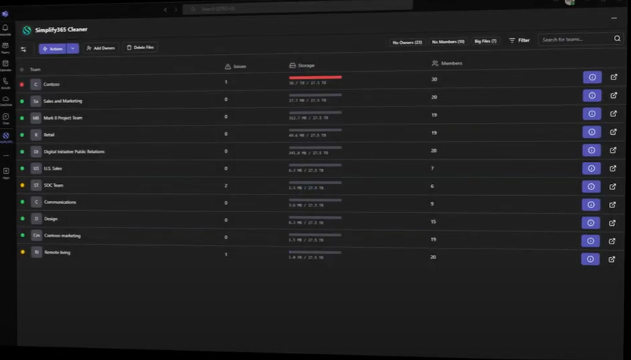 Microsoft 365-Umgebungen können schnell durch unkontrolliertes Datenwachstum überladen werden. Simplify 365 Cleaner identifiziert Bereiche unkontrollierten Wachstums und hilft Dir, Datenüberlastung effektiv zu erkennen und zu verwalten. Unser Tool bietet Einblicke in die Nutzungsmuster von Daten und ermöglicht es Dir, proaktive Schritte zur Vermeidung von Ineffizienz und Unordnung zu unternehmen.